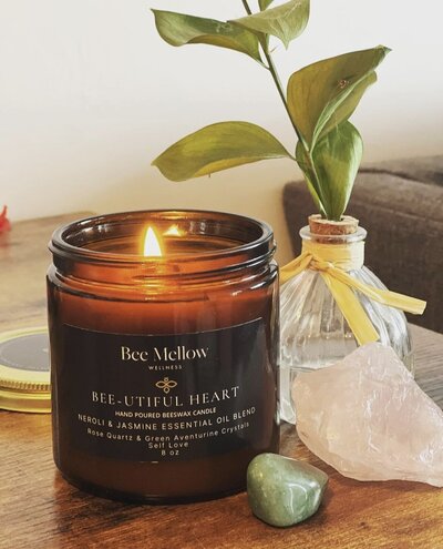 Each Bee Mellow Intention Candle is hand-poured with 100% natural beeswax, pure essential oils, a crackling wood wick and intuitively chosen crystals, then energetically infused with the Divine Light of Source. These candles support meditation, self-care, and energy work — helping you align with intention, clarity, and peace.